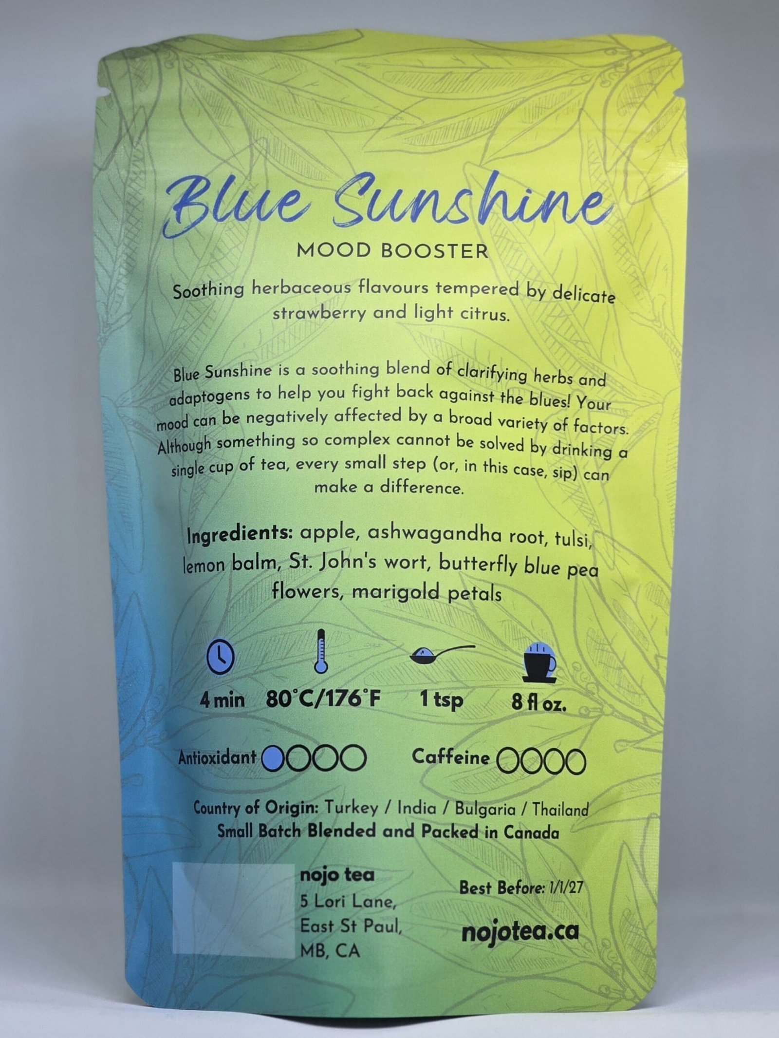 Apple, Ashwagandha root, Tulsi, Lemon balm, St. John’s Wort, Butterfly blue pea flowers, Marigold petals.