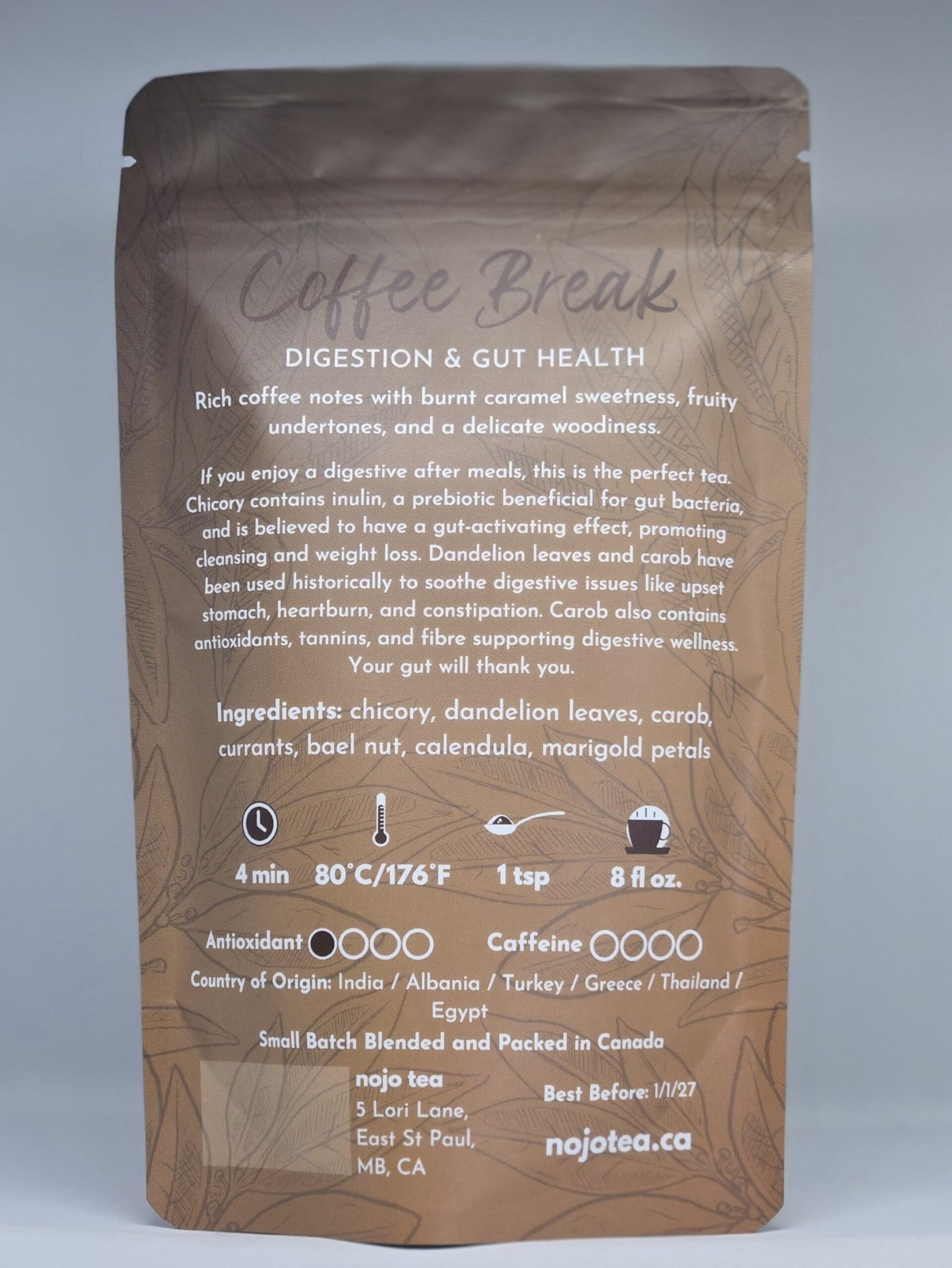 The delicious flavour of Coffee Break alone makes it an excellent choice for coffee lovers, but it’s more than just a morning indulgence. This caffeine-free tea is perfect as a post-meal digestif, promoting digestive wellness without the jitters. Chicory root, rich in inulin, acts as a prebiotic, supporting gut health by fostering helpful bacteria. These bacteria are linked to reducing inflammation, off-balancing harmful microbes, and improving mineral absorption. Chicory root is also known for mild cleansing and detoxifying effects, which many traditional medicine practices associate with aiding weight loss and digestive health. Take comfort in holistic remedies like Dandelion leaves and carob, long valued for soothing upset stomachs, heartburn, and minor constipation.