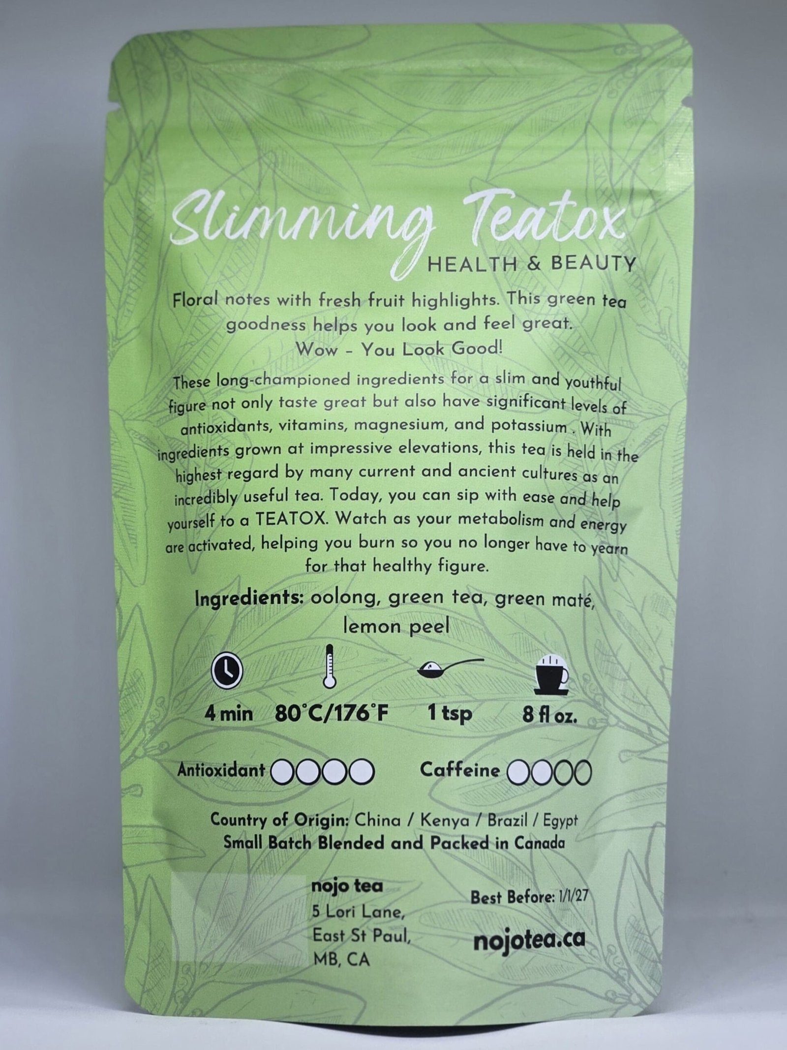 What sets our Slimming TeaTox apart? It’s the meticulous blend of high-altitude Kenya Oolong and Yerba Maté! Hailing from the Nandi Highlands of Kenya, this exceptional green tea is cultivated without pesticides, thanks to its unique high-altitude growing conditions. Besides being virtually organic by default, this Kenyan tea boasts laboratory-tested antioxidant levels that far surpass common teas. Combined with Yerba Maté, which in South America is often referred to as the “drink of the gods”, this rich body, floral flavoured tea blend doesn’t just taste amazing – it works hard to protect and revitalize your body with every cup. Antioxidants found in this blend are known to promote overall wellness, protect your cells against damage, and enhance your body’s natural processes including appetite suppression and metabolism boosting.